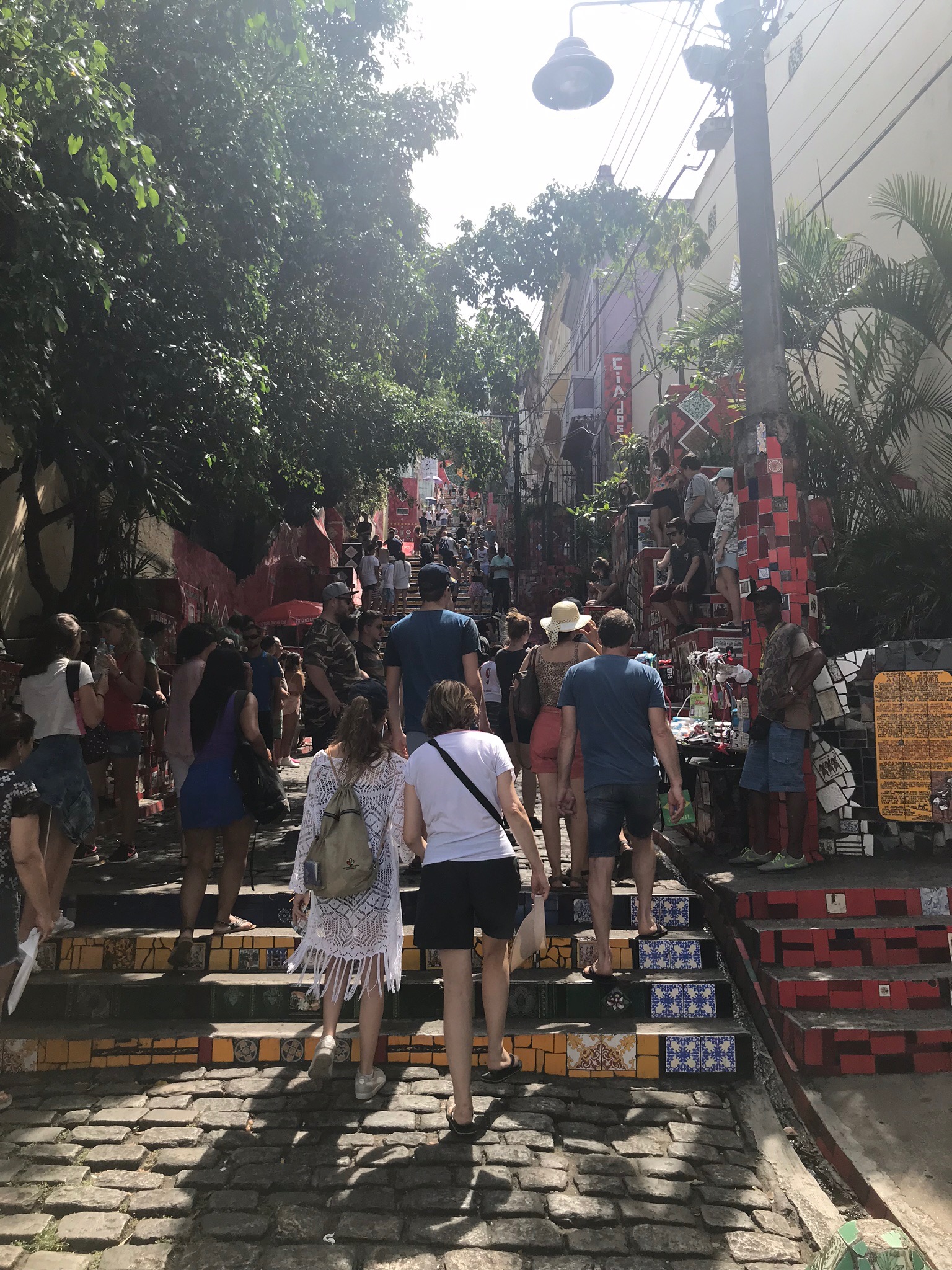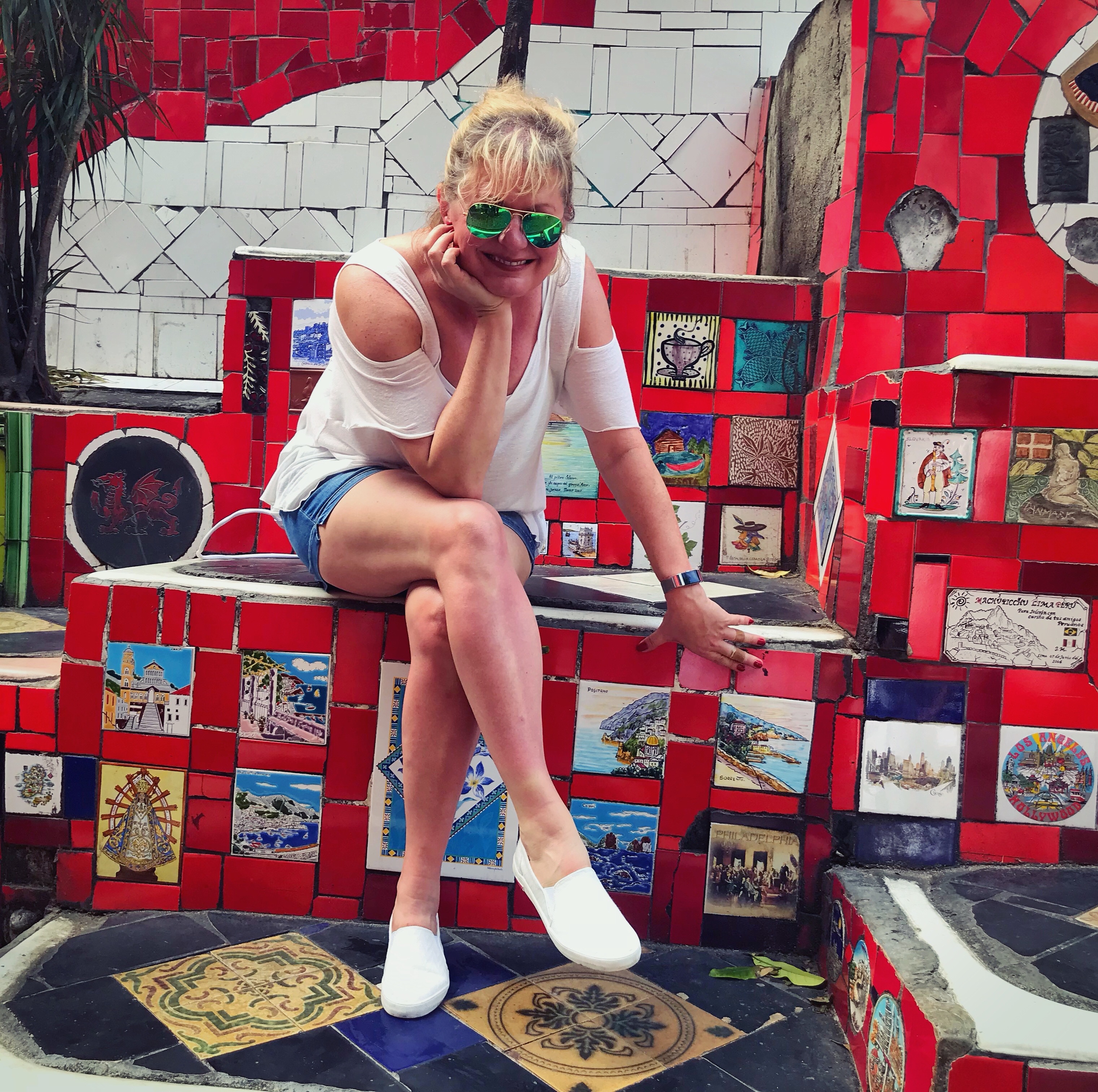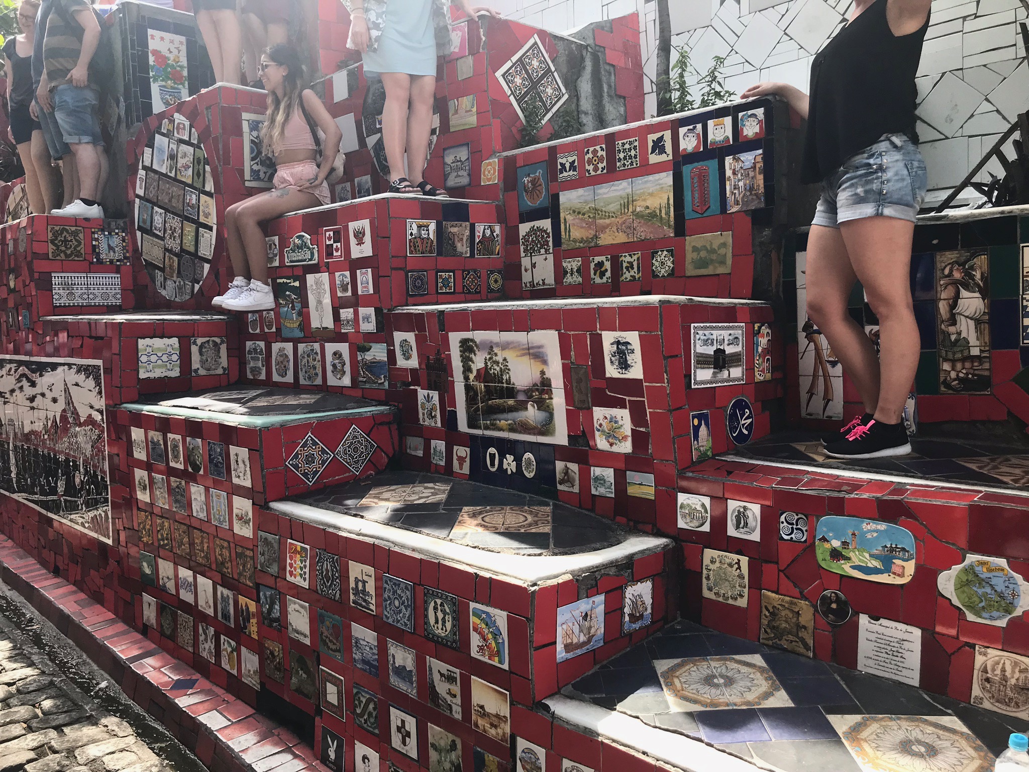 Now on to some steps I can climb…the Escadaria Selaron aka: The Selaron steps. This has to be one of my favorite stops in the city. It bridges two hip and trendy areas of Rio called Lapa and Santa Teresa. I guess you could call this the artist district. I have “certain” friends who would fit right in here!! 😉 The steps where created by a Chilean born artist Jorge Selaron. He started out simply trying to patch fix the steps in front of his home with tiles because they were falling apart and it spread from there. Over time, people started sending tiles from around the world and Jorge turned it into “his tribute to the Brazilian people” covering well over 200 steps.