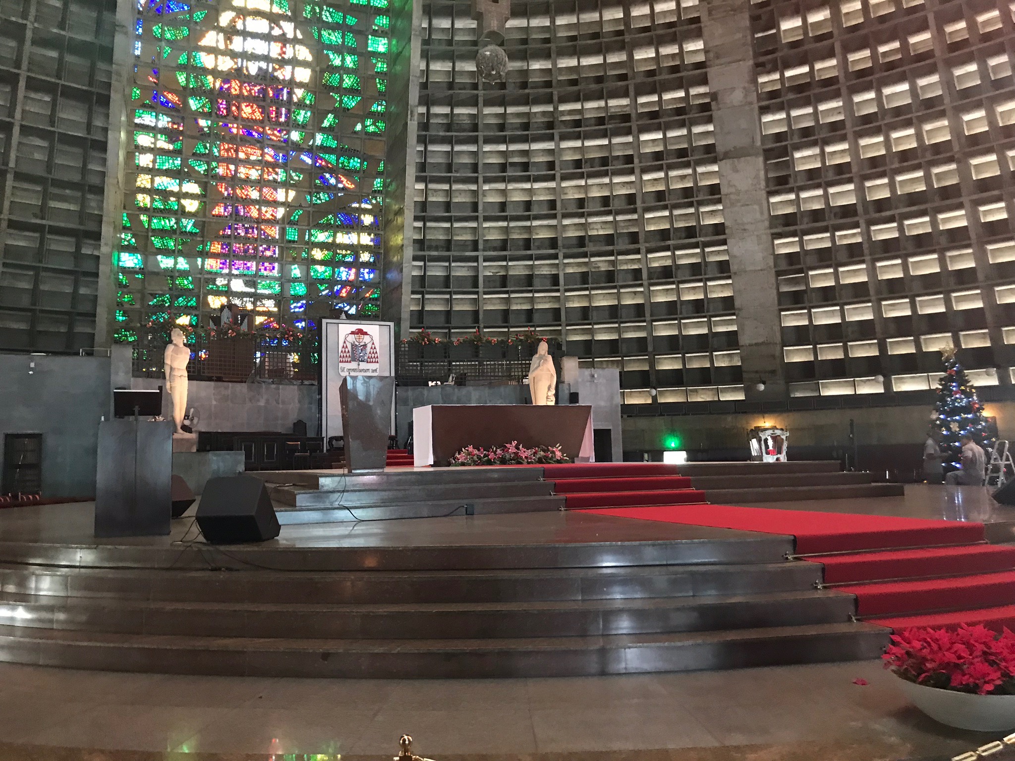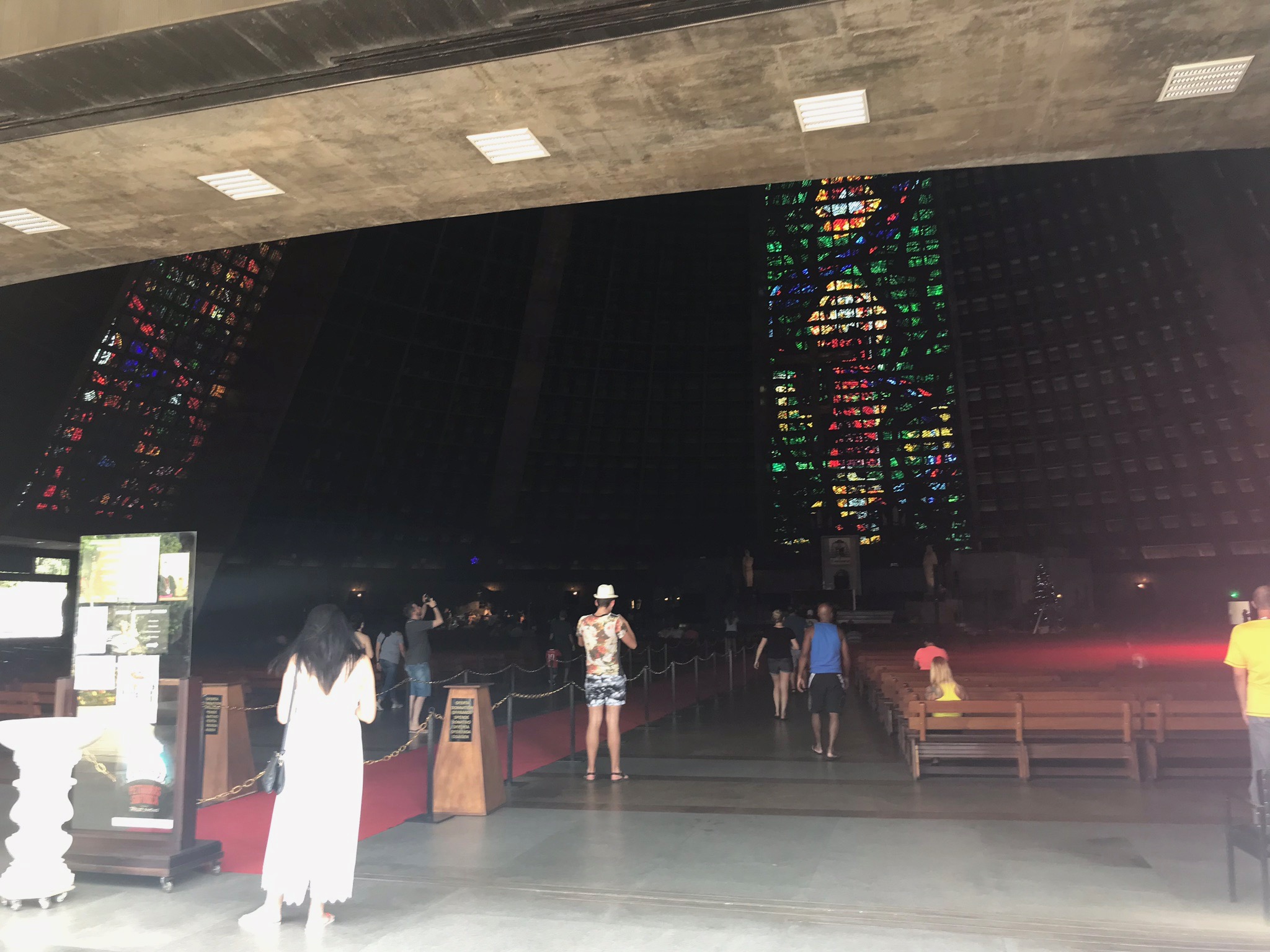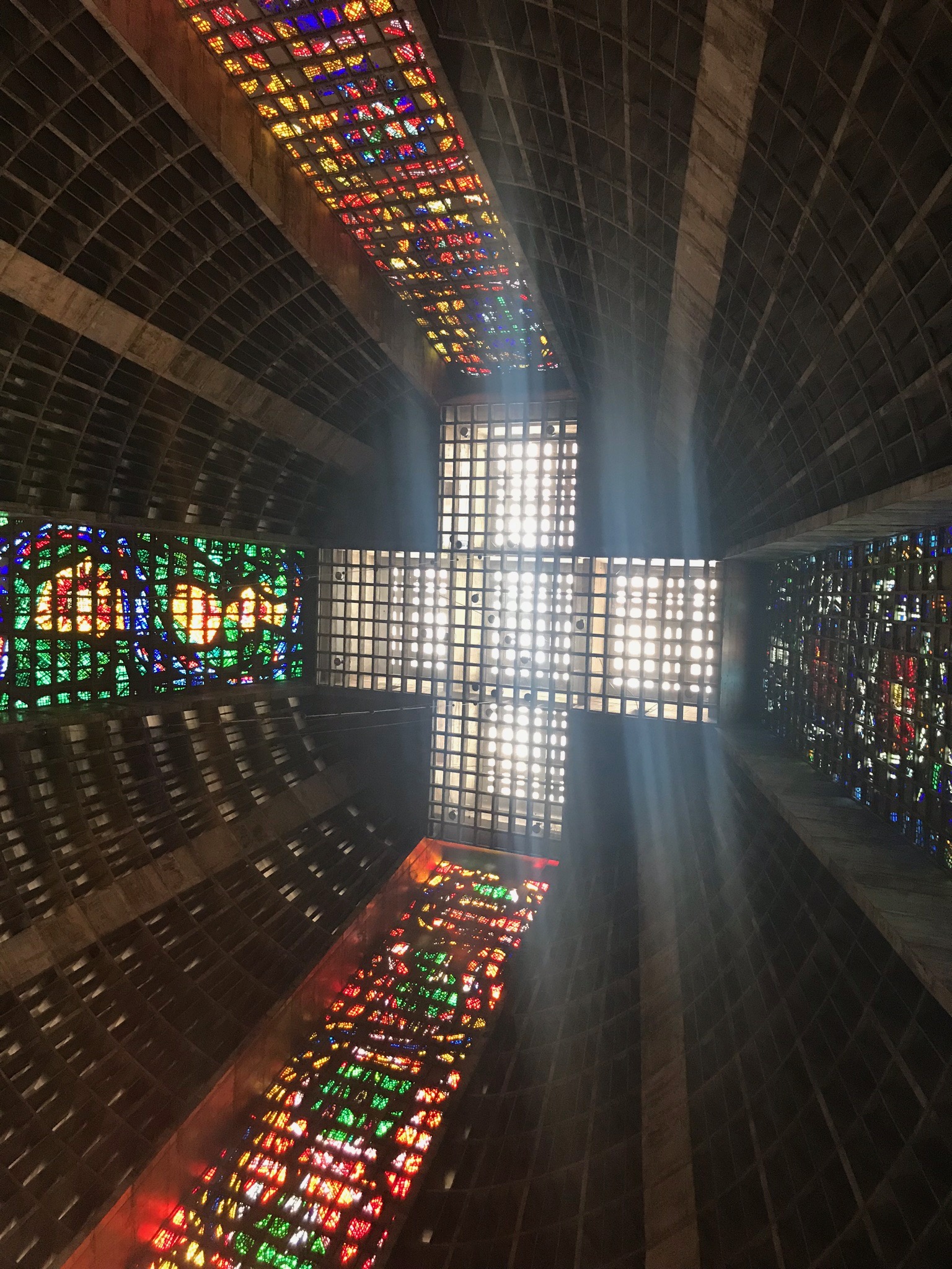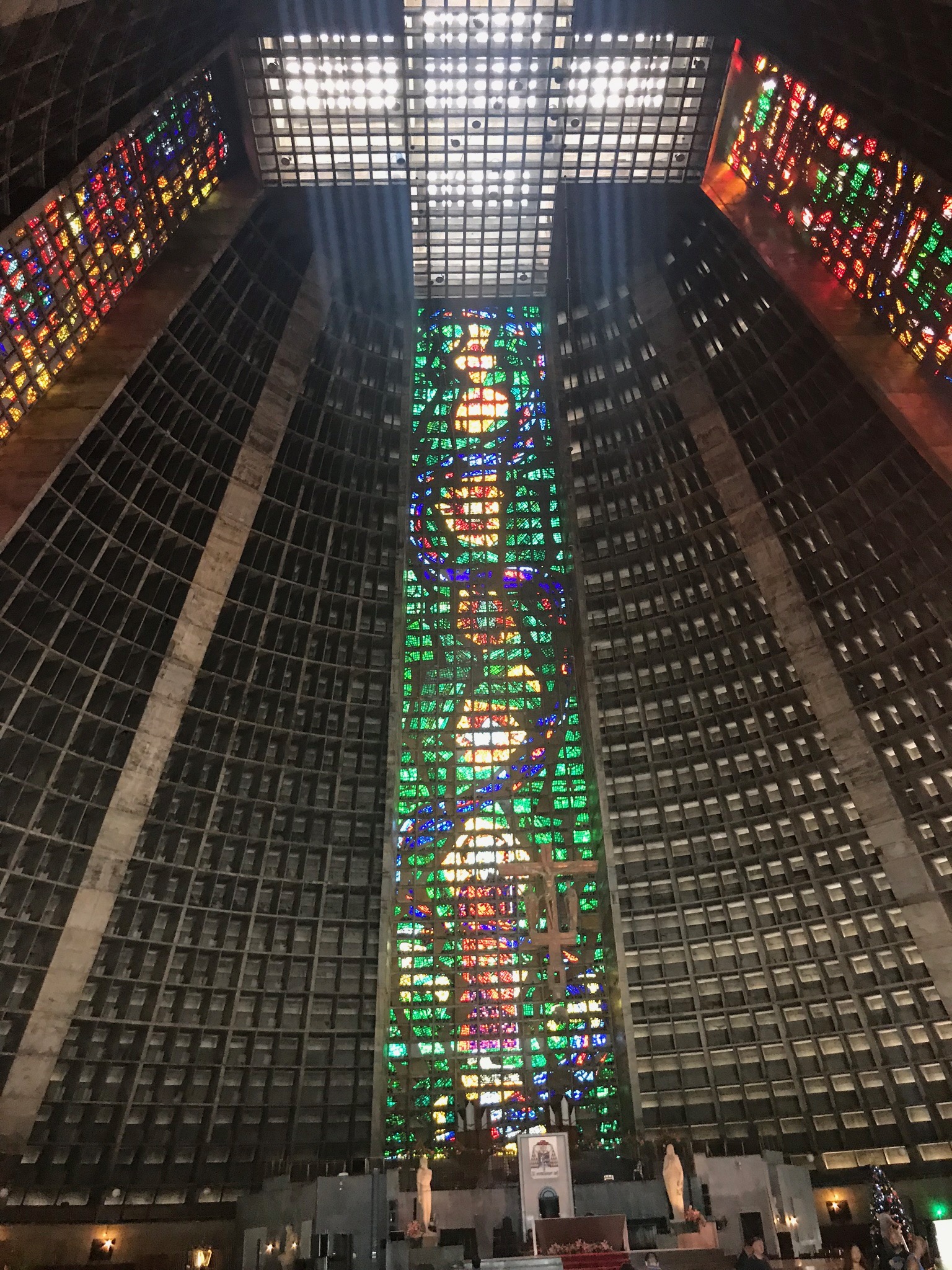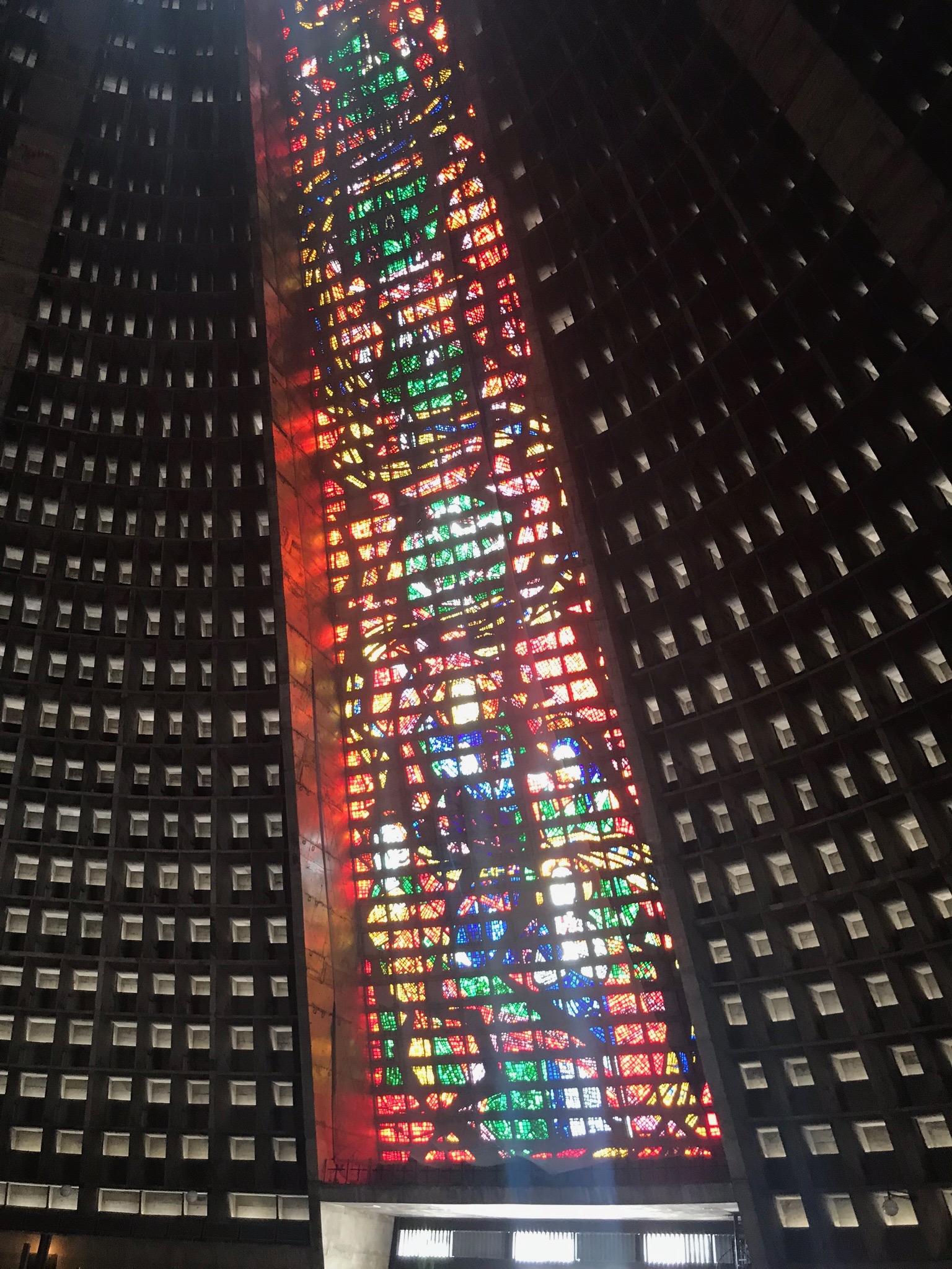 It’s home to the Archdiocese for Rio and was constructed from 1964 to 1979 in the Mayan architectural style of the pyramids. I’ve had the good fortune to climb up the steps of the Mayan pyramids in Mexico and while you can’t do the same at the Met, you certainly get a contemporary feel for those ruins. But those ruins did NOT have these windows! 4 stained glass windows that are 64 meters each from floor to ceiling. That’s 210 feet for my American friends. They are massive, bright and warm the interior of the Cathedral in a unique way.