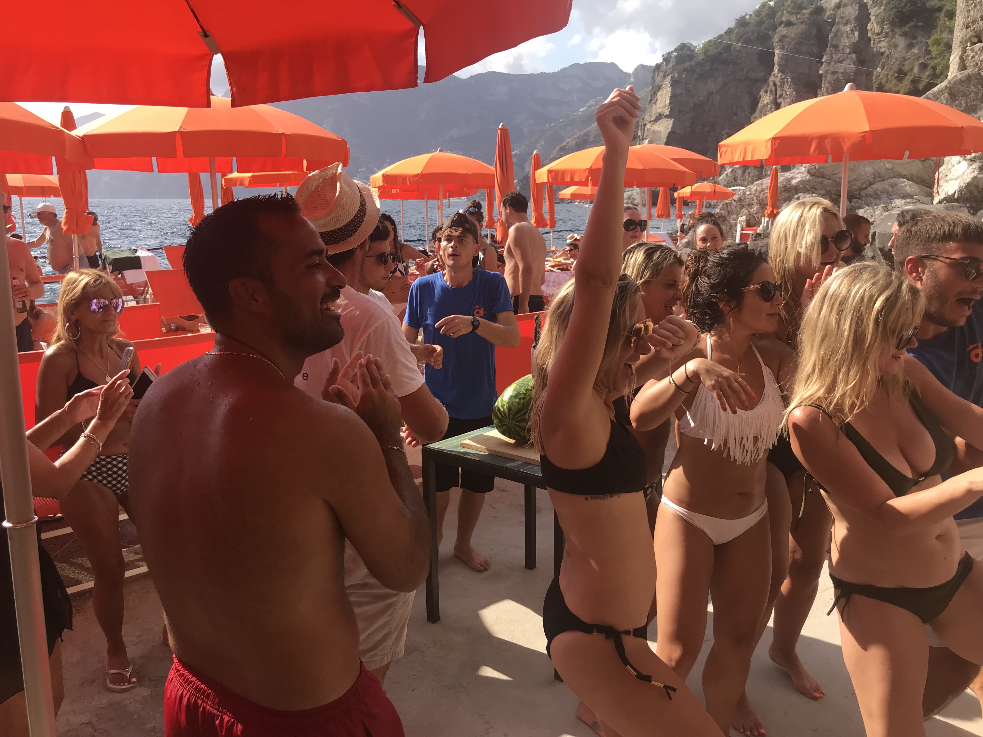 But, my new favorite beach is One Fire beach in Priano! My local friend Alessandro said, “you just have to go there” and he was right. It’s not a beach front with pebbles and such. It’s tucked into a cove and positioned on what looks to be a huge rock. You have to take a ladder to get into the water vs making that less than graceful walk on the pebbles. Besides the fact that a lady can walk like a lady here, what makes this place so special? There is music playing, an attentive wait staff that is singing and dancing and the food is quite good. But the culmination of the day is “Melon Time” at 4:30 pm. It’s quite the “ceremony” where large watermelons are cut into pieces with a saber and served to the guests and the dancing continues on until the last boat leaves. It’s a big beach party…or rather, party on a rock around a melon…Italians are so creative in coming up with reasons to celebrate!